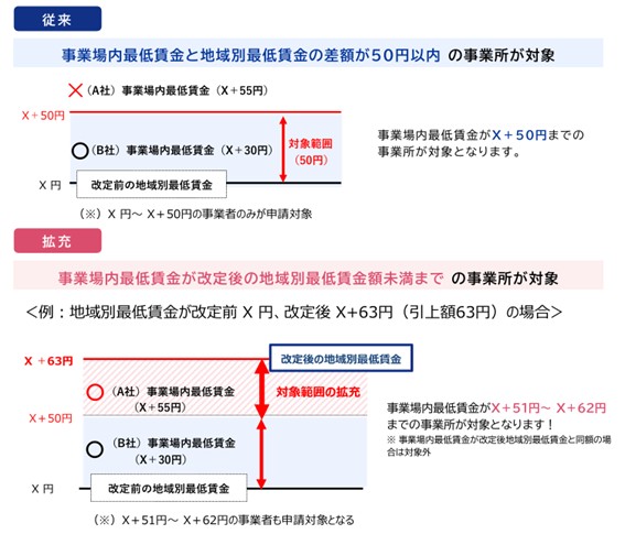 従来は、事業場内最低賃金と地域別最低賃金の差額が50円以内の事業所が対象とされてきましたが、事業場内最低賃金が改定後の地域別最低賃金額未満までの事業所が対象となりました。