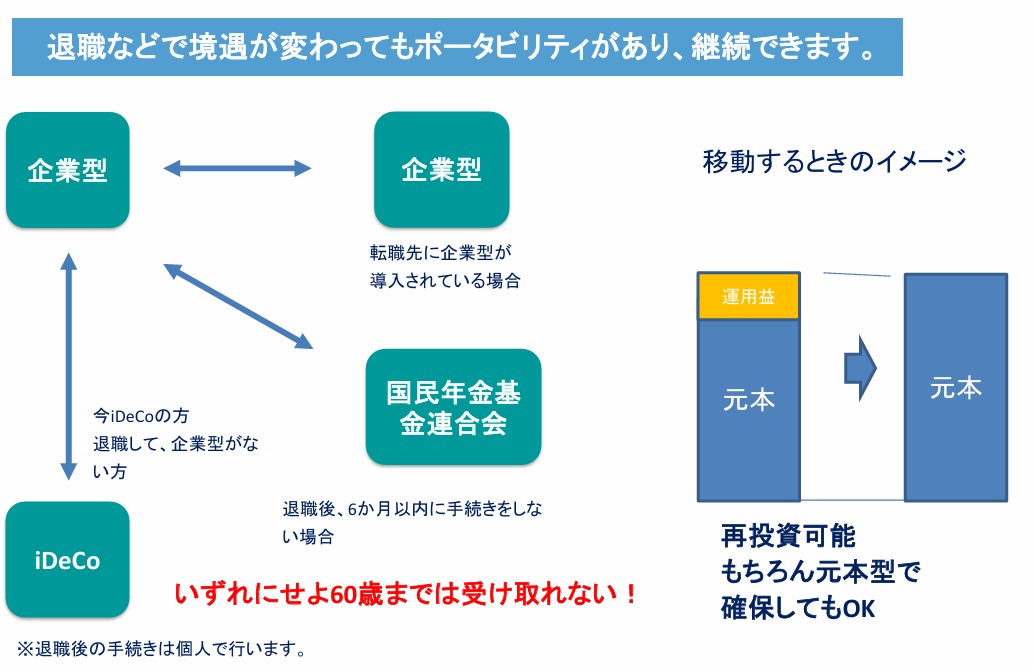 - ポータビリティとは「持ち運びができる」という意味です。確定拠出年金には、企業型確定拠出年金(企業型DC)と個人型確定拠出年金(iDeCo)とがありますが、異なる制度間で持ち運びができます。