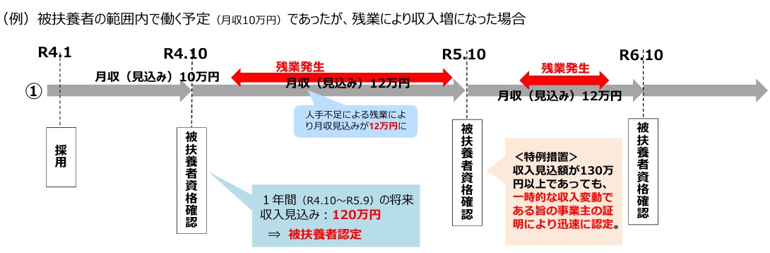 令和5年から当面の措置として行われてきた、人手不足による時間外労働等によって被扶養者の収入見込み額が一時的に扶養認定基準額を超えた場合、事業主の証明によって円滑に被扶養者として認定する措置が、恒久的な措置とされることになりました。
