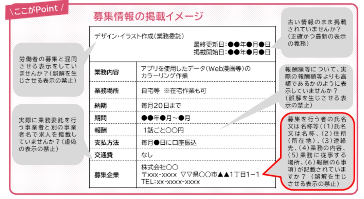 - 募集を行う者の氏名又は名称等の6事項((1)氏名又は名称等、(2)住所(所在地)、(3)連絡先、(4)業務の内容、(5)業務に従事する場所、(6)報酬)を記載する。