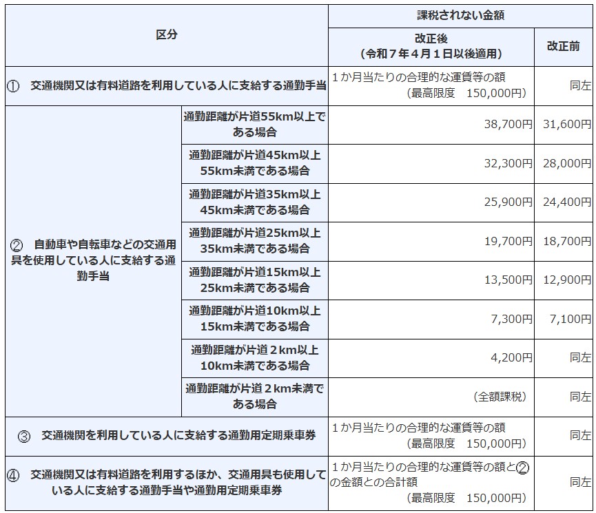 令和7年11月20日施行で、通勤のため自動車などを使用している従業員に支給する通勤手当の非課税限度額の引き上げが行われました。