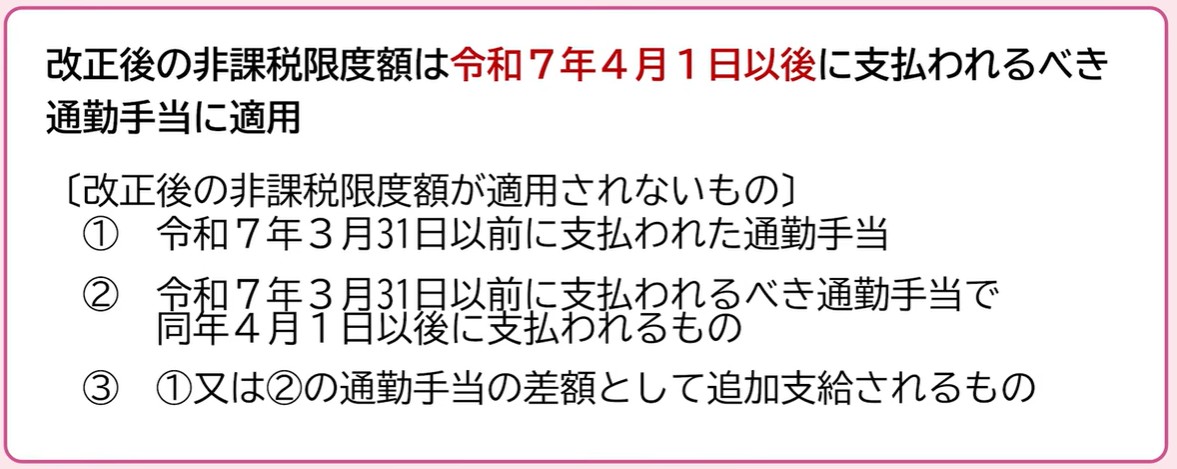 この引き上げは令和7年4月1日以後支払われるべき通勤手当について適用されます。