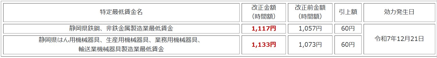 特定最低賃金とは、地域別最低賃金(静岡県では1,097円 11月1日から適用)よりも高い最低賃金が必要と認められた業種について設定されている最低賃金です。