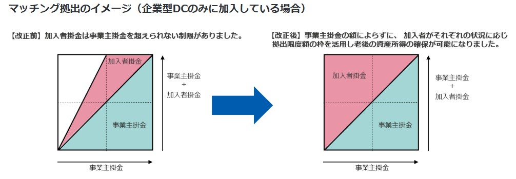 これまで加入者(従業員)が拠出できる掛金額は「事業主掛金額以下」に制限されていましたが、この上限が撤廃され、拠出限度額の範囲内であれば、事業主掛金額を超えて拠出できるようになります。