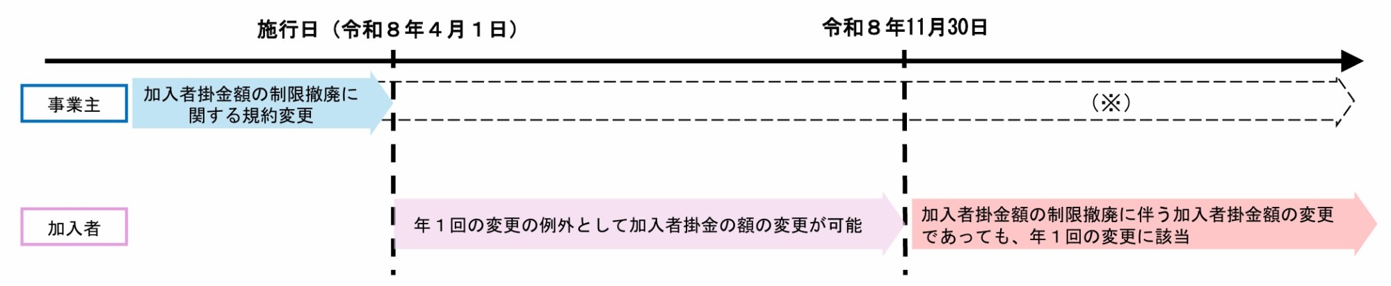通常加入者掛け金の金額変更は、拠出単位期間ごとに1回までとされていますが、2026年4月1日から11月30日までの間、制度改正後初めて事業主掛金額を超える拠出を行う加入者については、掛金額変更回数に関する経過措置が設けられる予定です。