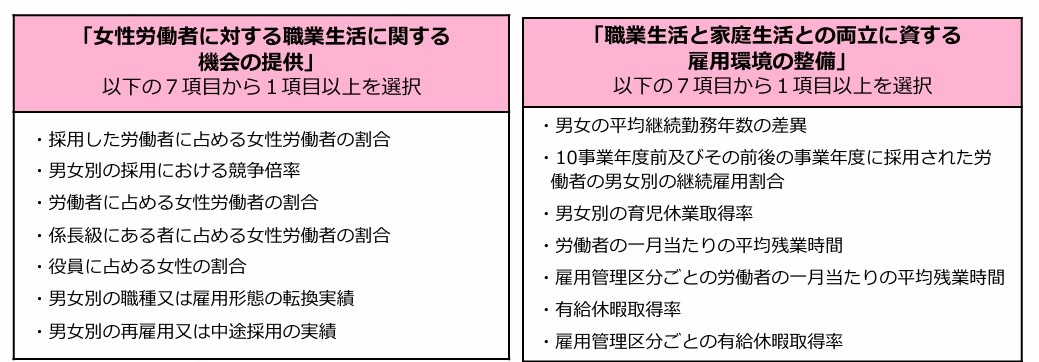 加えて、「女性労働者に対する職業生活に関する機会の提供に関する実績」、「職業生活と家庭生活との両立に資する雇用環境の整備」の各7項目のうちから各1項目以上を選択し、合計4項目以上の情報を公表することになります。