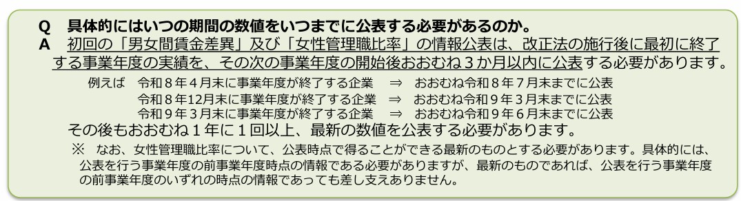 初回の「男女間賃金差異」及び「女性管理職比率」の情報公表は、改正法の施行(2026年4月)後、最初に終了する事業年度の実績を、翌事業年度の開始後おおむね3か月以内に公表する必要があります。