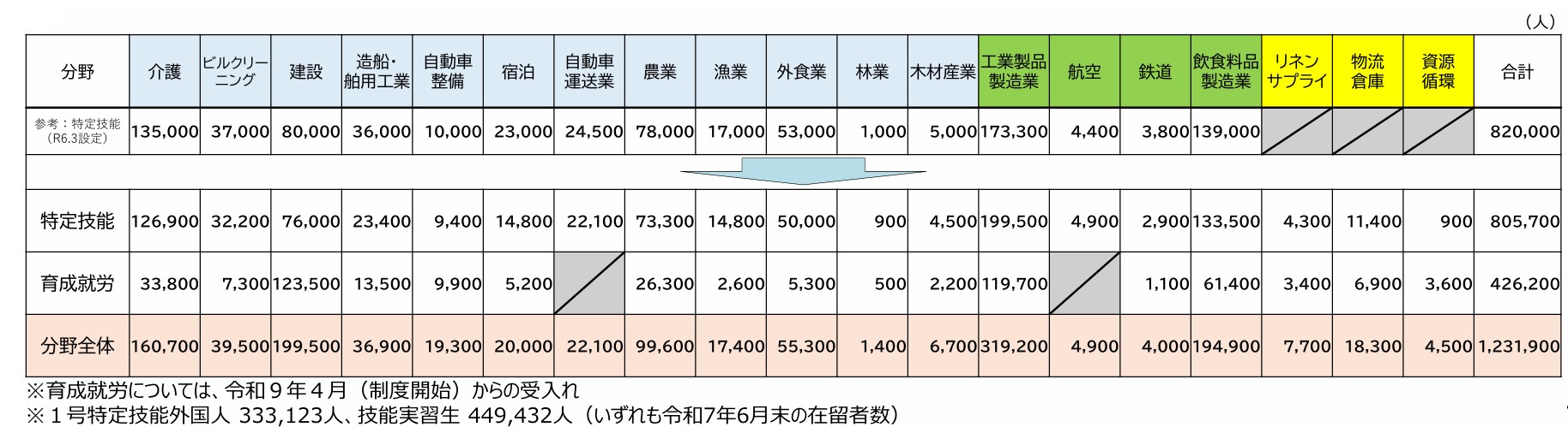 これらの人数は、各分野において生産性向上や国内人材確保の取組を行ってもなお不足すると見込まれる数として算出され、大きな経済情勢の変化が生じない限り、受入れの上限として運用されます。なお、現在、日本に在留する技能実習生は約45万人、特定技能外国人は約33万6千人です(2025年6月末時点)。