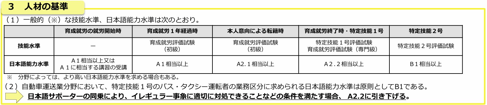 分野別運用方針では、育成就労制度の転籍制限期間や日本語水準などについても公表されています。