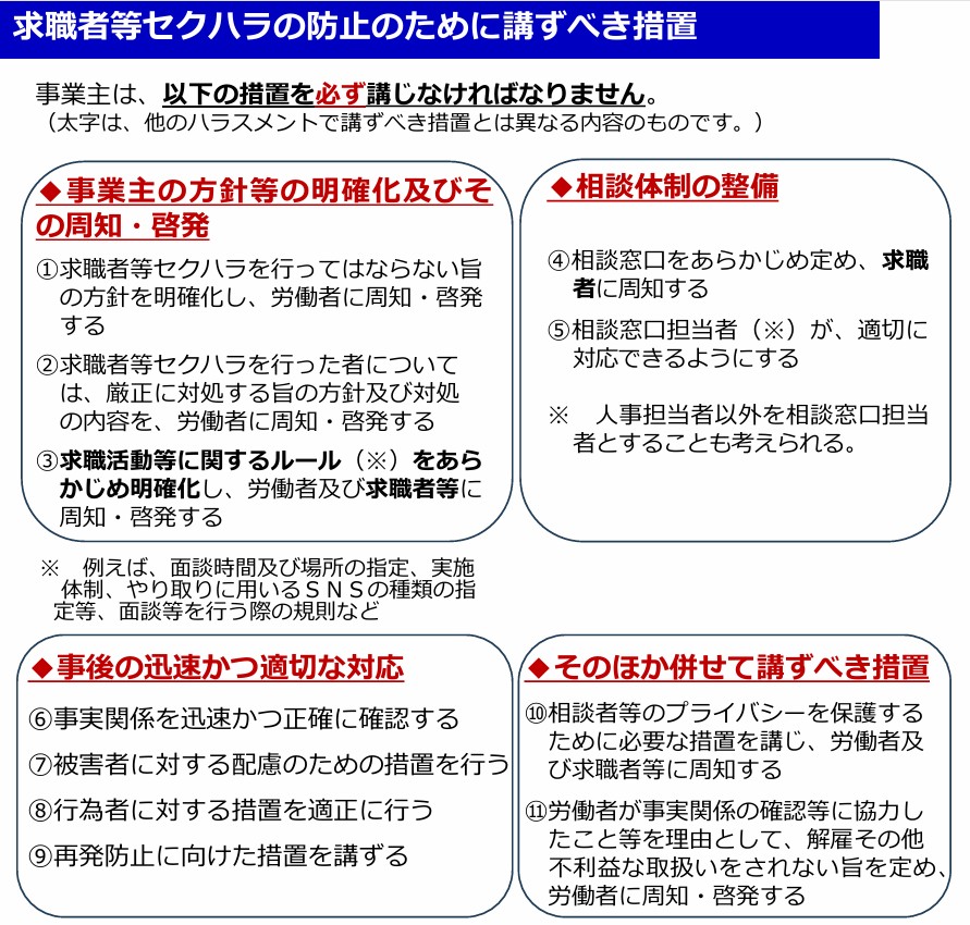 そのほか、大学のキャリアセンター等の求職者の関係者から就活セクハラに係る相談に関する情報提供があった場合は、連携し、適切な対応を行うことや、セクハラに留まらず、パワハラ又はマタハラに類する行為についても必要な注意を払うように努めることが望ましいとされています。