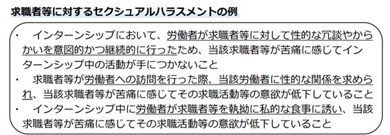 求職者等に対するセクシュアルハラスメントとは、事業主が雇用する労働者による「性的な言動」により求職者等による求職活動等が阻害されるものをいいます。