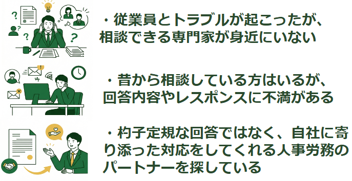「今の社労士を信頼して、困っているから相談したのに数営業日回答がない」というお話もお伺いすることもあり、当事務所は迅速なレスポンスに力を入れ、お客様のお悩みが早く解決することを大切にしています。また、今の時代は調べればだいたいわかることが多く、お客様は調べればわかる法律のことを知りたいわけではないと当事務所は認識しています。お客様が期待するのは、インターネットでは答えがわからない複雑化した労務相談の答えや法律一辺倒ではない他社事例も踏まえた回答であると考え、日々労務相談にご対応しております。
