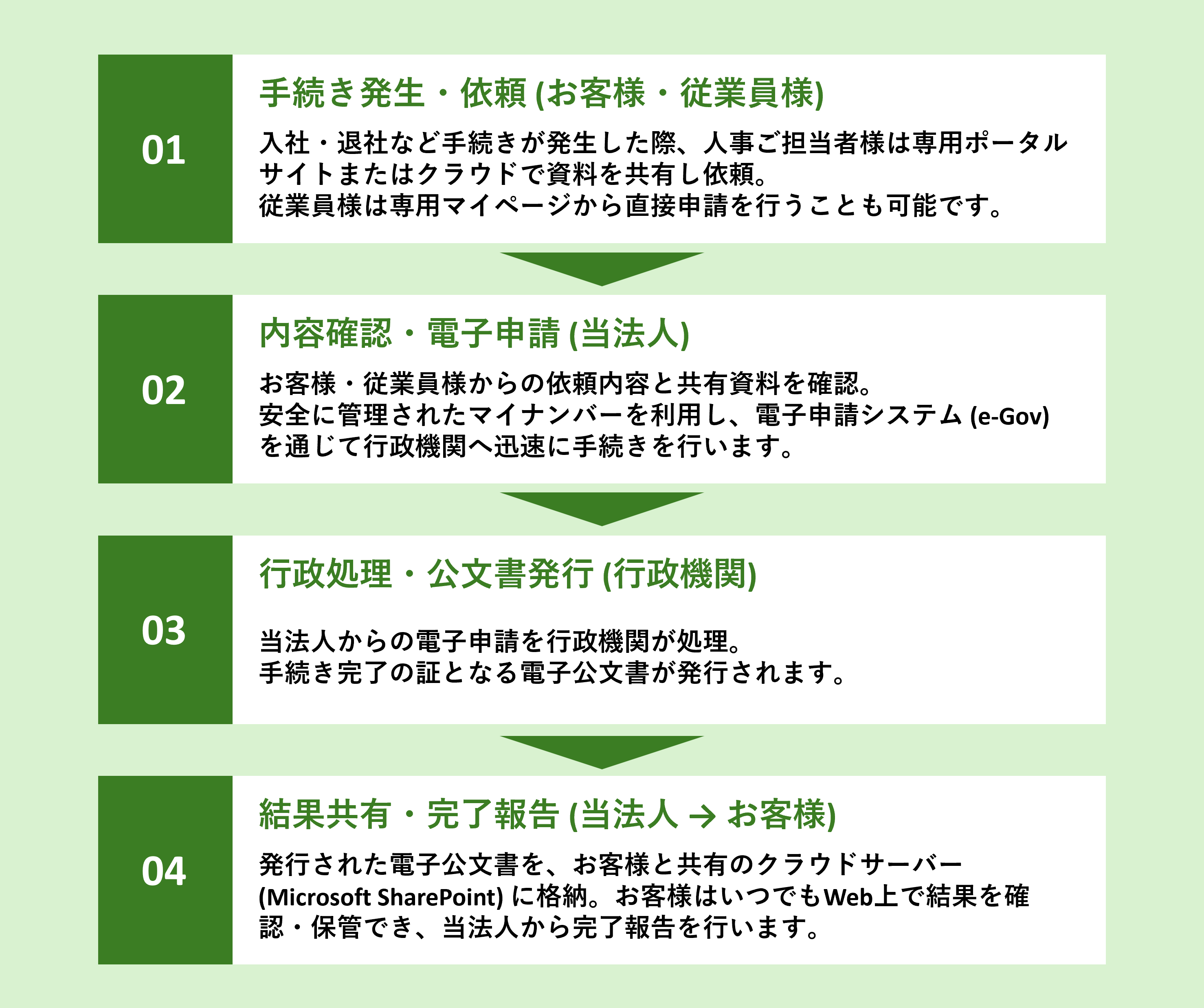 ご依頼を受け次第、当法人の専門スタッフが速やかに内容を確認し、行政機関への電子申請(e-Gov)を行います。マイナンバーは堅牢なデータベース(AWS)で安全に管理・利用します。